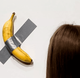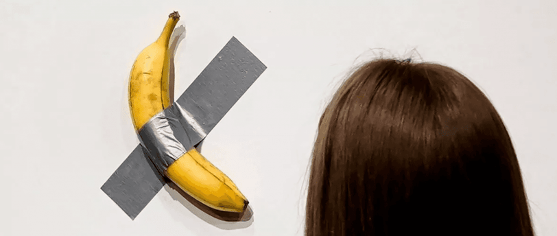 Meu raciocínio se concentra em um evento recente na cidade de Nova York, no qual a renomada casa de leilões Sotheby’s vendeu uma obra de arte de 2019 apelidada de “Comediante” por Maurizio Cattelan. O trabalho consistia em uma banana fresca colada na parede.